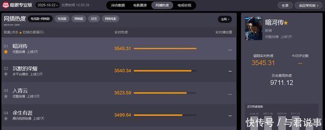 截止10月22日中午10时50分,从“猫眼专业版”实时数据显示可知,当前热播电视剧中,网播热度最高的五部剧分别如下: 1、《暗河传》 主演:龚俊/彭小苒/乔振宇 剧情点评:《暗河传》最难得的是,真正将古典又匠气的武侠范拍出来了,开了一个好头,电影质感和制作,审美高级,龚俊外形声音都贴合角色,演得很细腻,因为人物设定开头就是冷面杀手没有太多表情,所以很多都需要面部细微的颤动来表达,比如咬腮、蹙眉、甚至偶尔肌肉的抖动,龚俊赋予了这个人物灵魂。另外,他的音色好好听啊,我上班的时候忍不住点开,不看视频只听声音,也是另一种享受。所以总的来说,目前更新的集数剧情流畅,打戏精彩,怎么看这部剧都可以加入精品剧集名单,非常值得一追到底,希望不要让人失望。